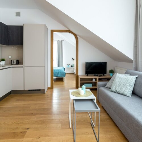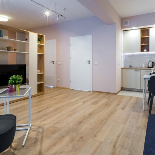 Each of our apartments is at least twice as large as the hotel room. Everyone has a kitchen and a day space with separate places for cooking, sleeping and rest. We offer apartments from the studio to three separate bedrooms.